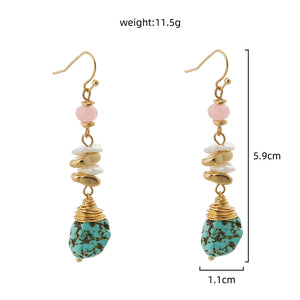 With a sleek modern shape, our drop earrings show off turquoise stones that contrast beautifully with the warm gold setting. Hand-wound with love.