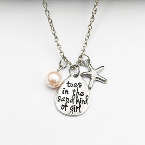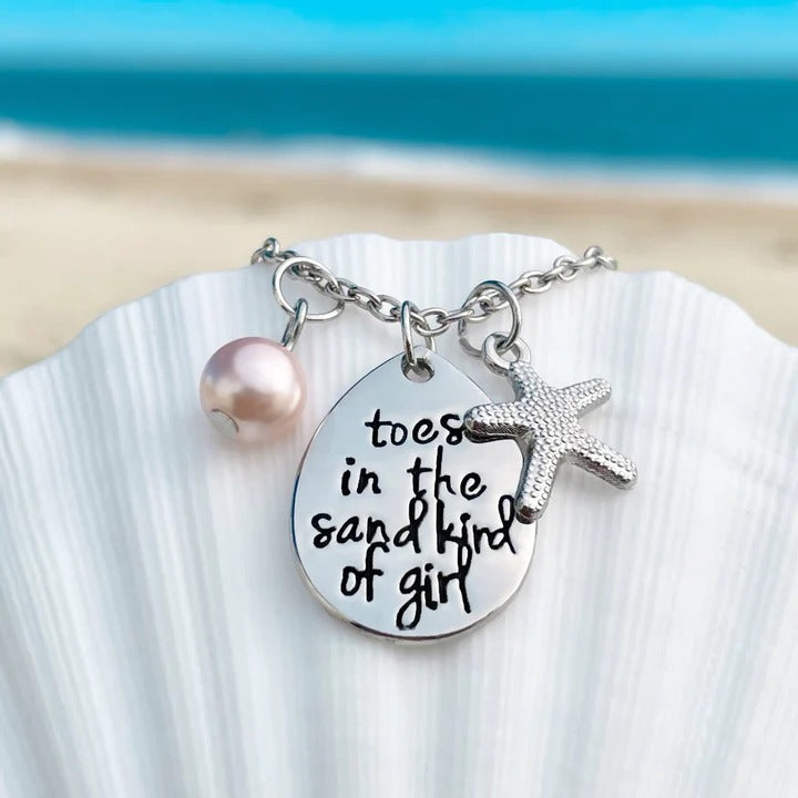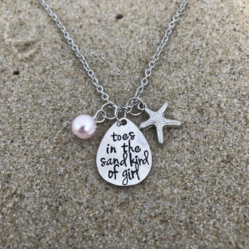 - Drop, hand-stamped "toes in the sand kind of girl"